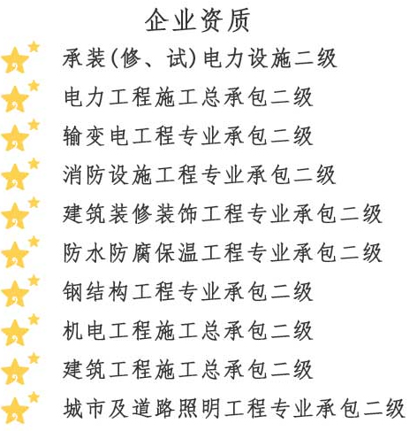 金楓電力集團(tuán)有限公司,成立于2015年5月28日,注冊(cè)資金6060萬(wàn)元,是一家專業(yè)從事電力工程施工的集團(tuán)化公司。公司經(jīng)營(yíng)范圍包括:電氣安裝服務(wù);建設(shè)工程施工;輸電、供電、受電電力設(shè)施的安裝、維修和試驗(yàn);測(cè)繪服務(wù);建筑勞務(wù)分包;建筑工程設(shè)計(jì);發(fā)電機(jī)及發(fā)電機(jī)組制造;建筑工程機(jī)械與設(shè)備租賃;工業(yè)工程設(shè)計(jì)服務(wù);技術(shù)服務(wù)、技術(shù)開(kāi)發(fā)、技術(shù)咨詢、技術(shù)交流、技術(shù)轉(zhuǎn)讓、技術(shù)推廣等。公司持有國(guó)家能源局頒發(fā)的承裝(修、試)電力設(shè)施許可證,承裝類二級(jí)、承修類二級(jí)、承試類二級(jí)資質(zhì);電力工程施工總承包二級(jí)資質(zhì);輸變電工程專業(yè)承包二級(jí)資質(zhì);建筑裝修裝飾工程專業(yè)承包二級(jí)資質(zhì);消防設(shè)施工程專業(yè)承包二級(jí)資質(zhì);防水防腐保溫工程專業(yè)承包二級(jí)資質(zhì);施工勞務(wù)資質(zhì);機(jī)電工程施工總承包二級(jí);建筑工程施工總承包二級(jí);城市及道路照明工程專業(yè)承包二級(jí);鋼結(jié)構(gòu)工程專業(yè)承包二級(jí)資質(zhì);公司已通過(guò)質(zhì)量管理體系認(rèn)證、環(huán)境管理體系認(rèn)證及職業(yè)健康安全管理體系認(rèn)證。并獲得省級(jí)信用評(píng)價(jià)AAA證書;連續(xù)多年納稅信用評(píng)價(jià)A級(jí)。